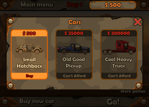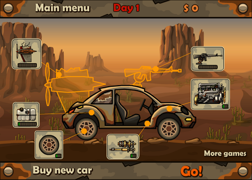 달릴 수 있는 만큼 달려 돈을 벌고, 그 돈으로 엔진·연료탱크·타이어·장갑·무기(기관총 등) 를 업그레이드 → 다음 날(런) 다시 출발해서 더 멀리 가며 최종 목적지까지 도달합니다.