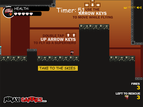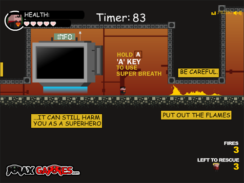 바닥의 초록색 물질(크립토나이트 같은 것)을 밟으면 초능력이 빠르게 소모돼 다시 일반인으로 돌아오고, 체력이 다 달면 실패입니다. 그래서 시간·체력·초능력 게이지를 관리하면서 불을 끄고, 장애물을 부수고, 사람을 구하는 게 핵심 플레이 패턴입니다.