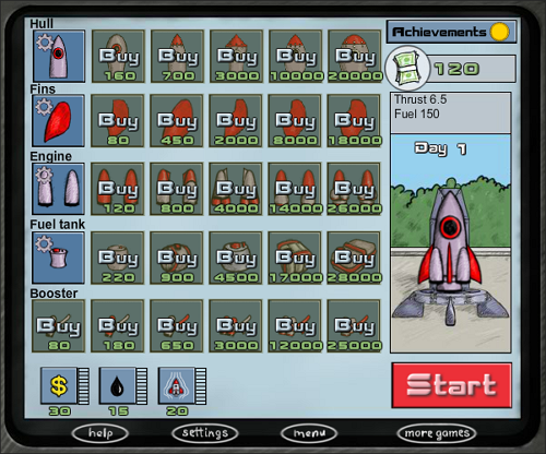 로켓을 발사해 최대한 효율적으로 고도를 올리고(연료/보너스 수집, 충돌 피하기), 비행 후 얻은 보상으로 파츠를 업그레이드하며 가장 적은 ‘Day’로 우주 도달을 노립니다.