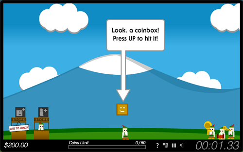 WASD 또는 방향키로 이동하고 UP키나 W키로 점프해 코인박스를 헤딩으로 때리면 코인이 드랍됩니다.