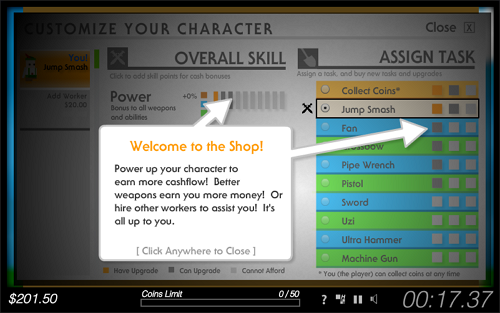 워커에게 Jump Smash(공격) 또는 Collect Coins(수집) 임무를 부여해 역할을 분담시키고 점점 강력한 무기로 업그레이드하며 코인 획득 효율을 극대화하는 것이 핵심입니다. 최종 목표는 $1,000,000을 모아 전술 핵폭탄을 구매해 코인박스를 우주로 날려버리는 것입니다.