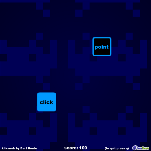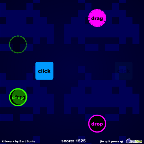 화면에 “클릭하라, 드래그하라, 떨어뜨려라, 스페이스바를 눌러라” 같은 지시가 나오고, 그 말을 그대로 따라 하면서 화면의 동그라미·아이콘들을 가능한 한 빨리 없애는 게 목표예요.