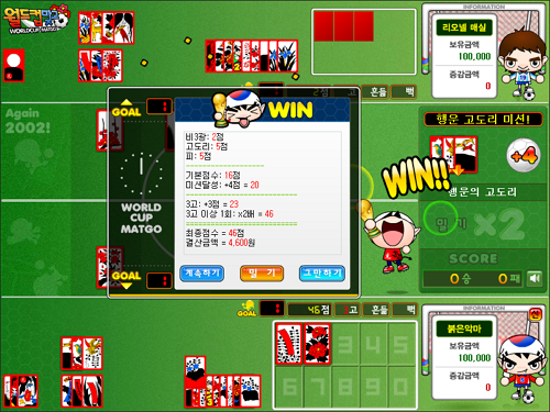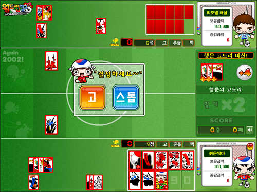 월드컵맞고는 2002년 한일 월드컵의 감동을 담은 축구 테마 고스톱 플래시게임입니다.
