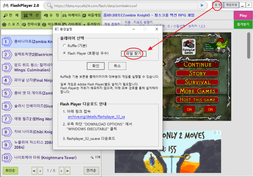 2. FlashPlayer 앱 설정에서 "Flash Player (호환성 우수)" 옆 파일 찾기 선택