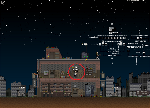 초반 상태는 총알 15발, 생명력 100으로 캐릭터위에 표시되어 있습니다.
