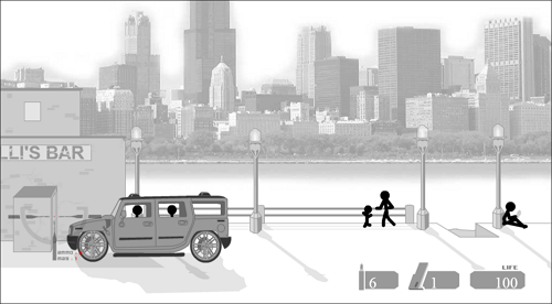 화면에 여러 스틱맨이 지나다닙니다