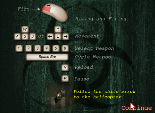 10분의 시간 제한 안에 하얀 화살표를 따라 헬기 지점까지 이동하며, 길을 막는 좀비들을 다양한 무기로 처치해야 합니다.