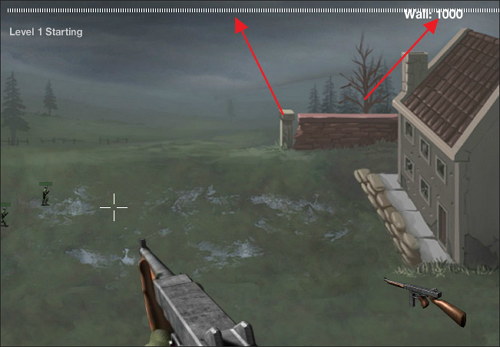 방어벽(Wall)이 완전히 파괴되면 게임 오버이므로, 적들이 건물에 도달하기 전에 모두 사살해야 합니다.