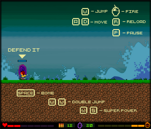 포탈을 향해 끝없이 밀려오는 좀비와 몬스터를 총으로 막아내는 횡스크롤 슈팅 게임으로, WASD 이동과 마우스 사격에 더블 점프·슈퍼파워·폭탄까지 활용하는 역동적인 전투가 핵심입니다.