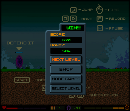 웨이브가 끝날 때마다 열리는 상점에서 12종의 총기 중 하나를 구입하거나 체력·포탈 에너지를 업그레이드해 점점 강해지는 적에 대비할 수 있습니다.
