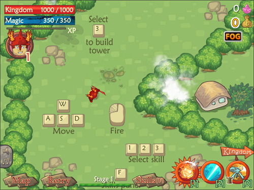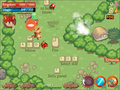 몬스터의 공격으로부터 왕국을 지켜야 하는 누크 디펜스는 WASD 이동과 마우스 클릭 공격을 기본으로, Fire Splash·Magic Link·Turret 세 가지 스킬을 전략적으로 조합해 싸우는 액션 디펜스 게임입니다.