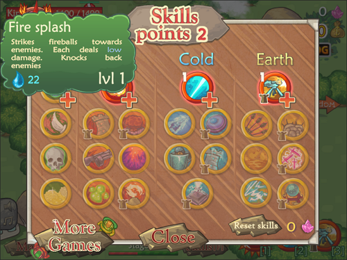 스킬 종류: 3종 (Fire Splash, Magic Link, Turret)