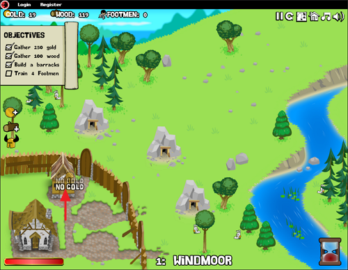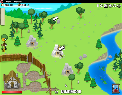 금광과 나무에 마우스를 올려두면 골드와 목재 자원이 자동 채집되고 성 주변에 마우스를 올리면 성 체력 회복·업그레이드, 병영 같은 건물에 올리면 보병·궁병·기병 유닛 생산이 진행됩니다.