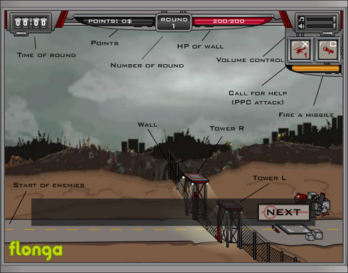 성벽 HP 200을 유지하며 라운드가 올라갈수록 쏟아지는 적의 물량을 직접 공격과 미사일·헬기 스킬로 헤쳐나가는 것이 핵심이며, 적 처치로 모은 돈으로 타워를 업그레이드해 자동 방어력을 높이는 성장형 전략이 요구됩니다.