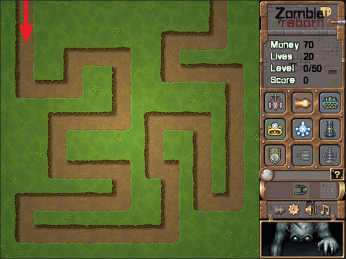 좀비 TD 리본 (Zombie TD Reborn)는 타워를 세워 왼쪽(빨간 화살표)에서 들어오는 좀비가 길을 따라 끝까지 도착하기 전에 막는 방식입니다.
