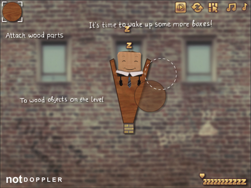 화면에 나무 블록·막대·휠 같은 오브젝트를 놓아서 기울이거나 떨어뜨리거나 굴려서 박스를 움직이게 만들면 깨는 구조입니다.
