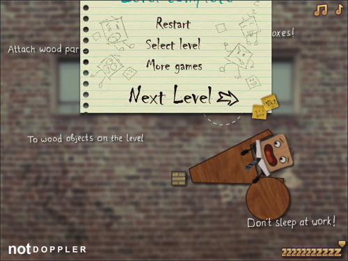 스테이지마다 박스가 책상·선반 같은 사무실 배경 위에서 자고 있으며 제한된 모양의 나무 조각만 사용해서 구조를 만들어야 합니다.