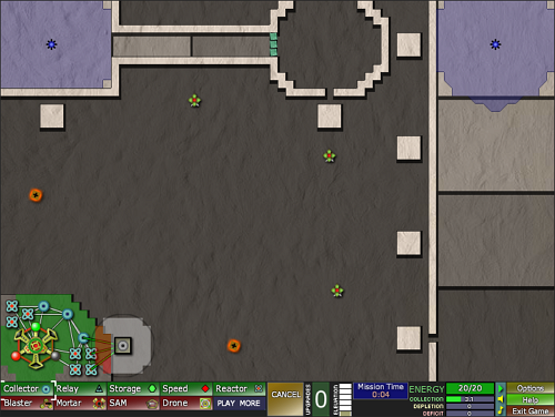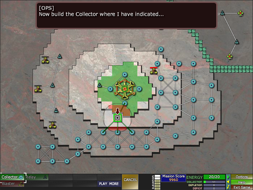 에너지 생산(Collector 등) → 네트워크(연결) 유지 → 무기/방어 건설로 파란 “Creeper(유체)” 확산을 밀어내며 맵 목표를 달성