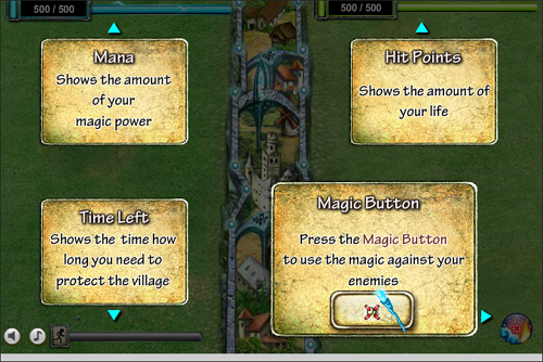 Mana를 소비하여 강력한 마법을 발동할 수 있으며, 제한 시간 내에 성의 Hit Points를 지키는 것이 목표입니다.