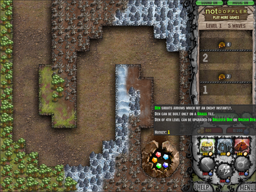 Den, Crypt, Temple 세 종류의 타워는 각각 풀밭, 눈밭, 바위 지형에만 건설할 수 있어 지형을 읽고 배치하는 전략적 사고가 클리어의 핵심입니다.