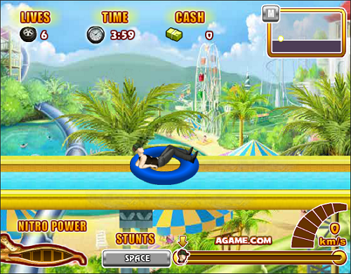 게임특징: 워터파크/슬라이드 같은 코스에서 튜브·바이크 등 다양한 탈것, 니트로 가속, 스턴트 기반 보상, 업그레이드·해금 요소가 핵심입니다.